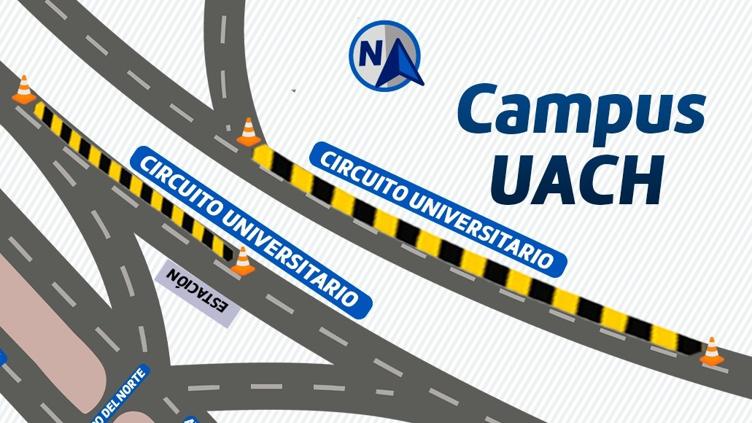 A partir del lunes 6 de octubre se aplicará una nueva reducción de carriles en el Circuito Universitario, a la altura de la Facultad de Ingeniería de la UACH, en el sentido sur–norte, debido a los trabajos de la obra Trayecto Vial Seguro.