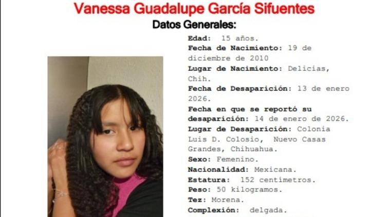 La Fiscalía General del Estado de Chihuahua emitió una alerta de búsqueda para localizar a Vanessa Guadalupe García Sifuentes, adolescente de 15 años, quien fue reportada como desaparecida el pasado 13 de enero de 2026 en el municipio de Nuevo Casas Grandes.