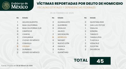 Específicamente, el reporte correspondiente al 26 de febrero contabiliza a nivel nacional 45 víctimas por delito de homicidio.