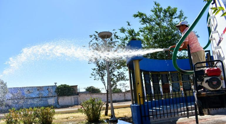 La Dirección de Parques y Jardines riega de manera diaria camellones y parques públicos de Ciudad Juárez, esto para mejorar el arbolado, señalan.