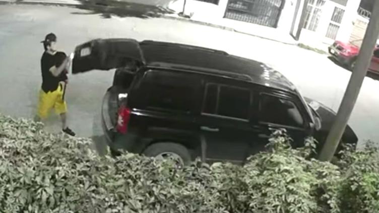 Video de esta madrugada muestra a un hombre de shorts amarillos, camisa color oscuro, con una gorra y tenis de color oscuro con zuelas blancas abre una camioneta estacionada para robar una mochila y varios objetivos de valor.