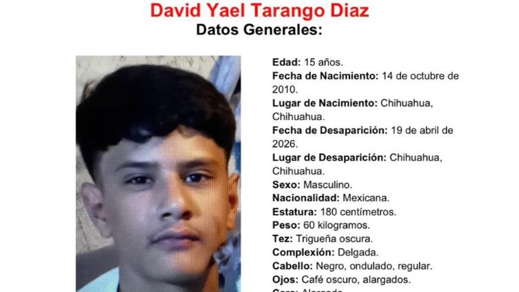 Autoridades estatales activaron la búsqueda de David Yael Tarango Díaz, de 15 años de edad, quien fue reportado como desaparecido el pasado 19 de abril de 2026 en la ciudad de Chihuahua.