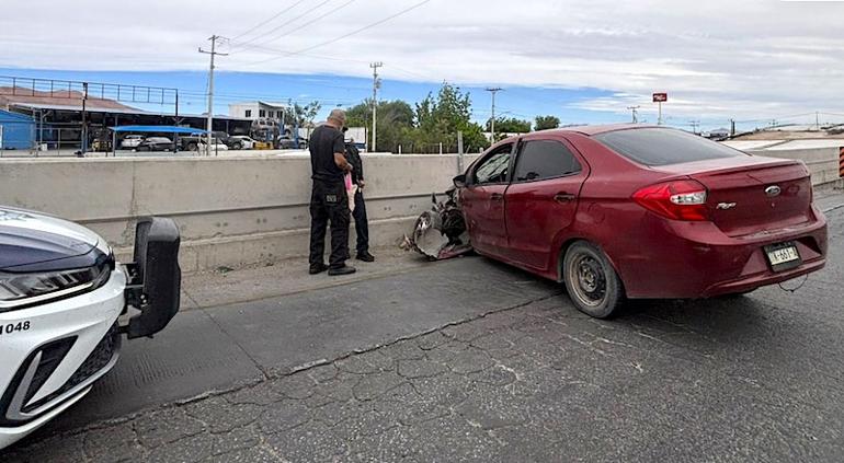 Un vehículo Ford Figo de color guinda, con placas de circulación DTK-661-A, chocó esta mañana contra el muro de contención de la rampa de acceso al distribuidor vial ubicado en la obra de la Fuerza Aérea y Carretera Aldama, en la ciudad de Chihuahua, sin que se reportaran personas lesionadas.