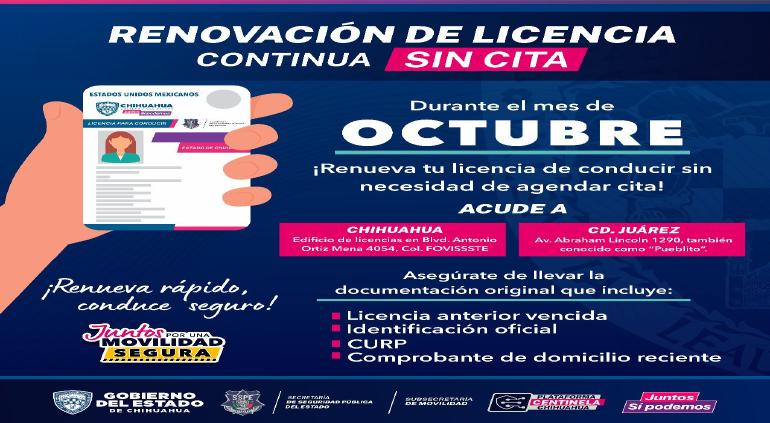 La Secretaría de Seguridad Pública del Estado (SSPE) anunció que, durante el mes de octubre, los ciudadanos podrán renovar su licencia de conducir sin necesidad de agendar cita en Chihuahua.