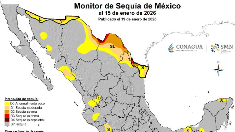 Para el corte de mitad de enero del 2026, solo la región de la frontera noreste y norte presentan altos niveles de sequía. La región centro-sur muestra el nivel más moderado de falta de lluvias.