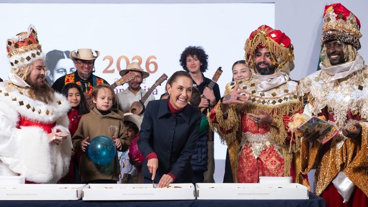 La presidenta de México, Claudia Sheinbaum Pardo, encabezó la tradicional partida de la rosca de Reyes en La Mañanera del Pueblo, acompañada de niñas y niños para celebrar la visita de los Reyes Magos al niño Jesús.