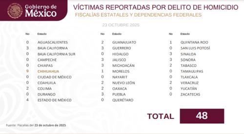 Mientras que a nivel nacional reportaron 48 víctimas de homicidio, lo que está por debajo del promedio de lo que va de octubre (50.9), destacó sólo un estado por su altas cifra.