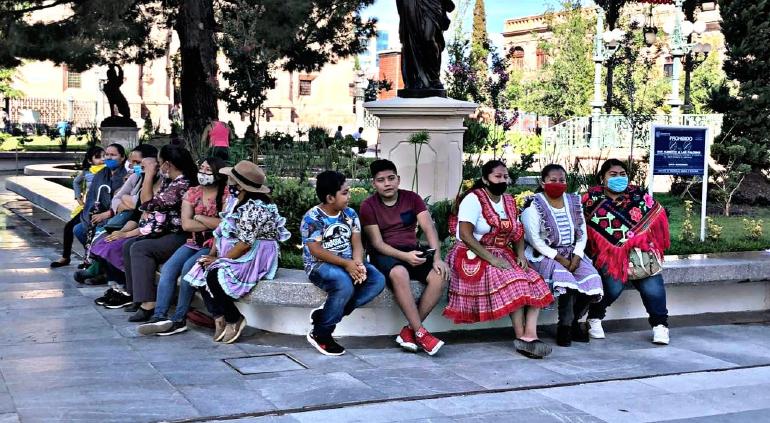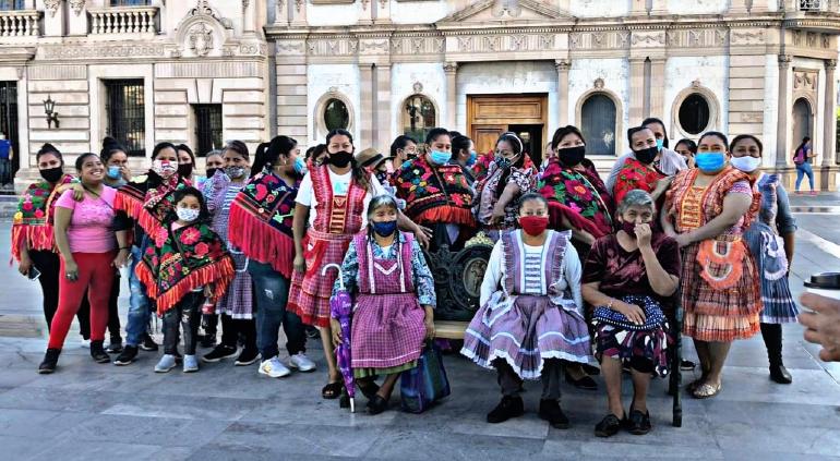 Integrantes de la comunidad indígena Mazahua de Santa María acudieron esta mañana a la Presidencia Municipal para gestionar apoyos para sus niños y adultos mayores ante el impacto económico de la pandemia del coroanvirus, además de solicitar espacios para comercializar sus artesanías en la calle Victoria.