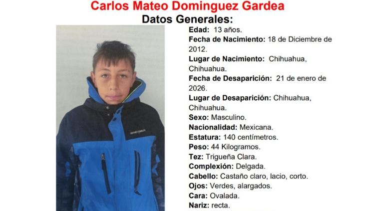 Autoridades estatales solicitan el apoyo de la ciudadanía para localizar a Carlos Mateo Domínguez Gardea, menor de 13 años de edad, reportado como desaparecido el 21 de enero de 2026 en la ciudad de Chihuahua, Chihuahua.