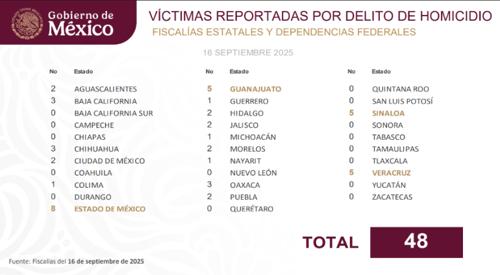 Estas entidades fueron Estado de México (ocho), Guanajuato, Sinaloa y Veracruz, los tres con registraron cinco víctimas, cada uno, por delito de homicidio.
