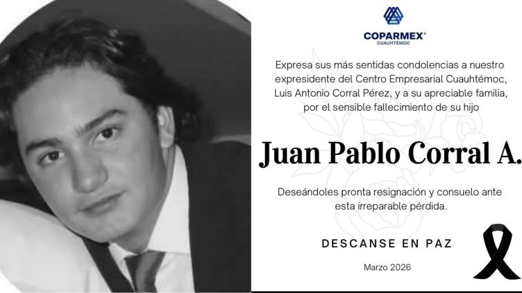 Diversos organismos empresariales y usuarios en redes sociales expresaron condolencias por el fallecimiento de Juan Pablo Corral, hijo del empresario manzanero Luis Antonio Corral Pérez.