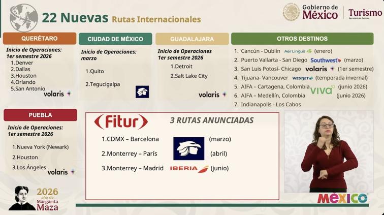 La funcionaria detalló que se trata de 32 rutas nacionales y 22 internacionales que comenzarán a operar durante el primer semestre de 2026.