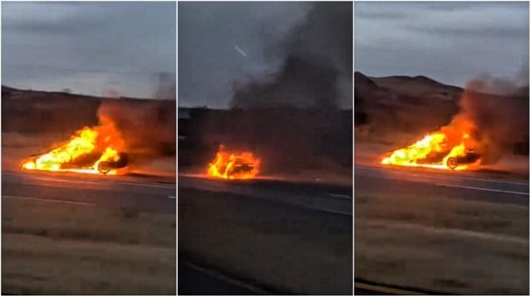 Un vehículo totalmente en llamas fue captado por ciudadanos que circulaban por la carretera de Cuauhtémoc a Chihuahua.