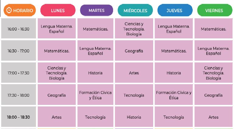 El primer grado de secundaria se impartirá de 16:00 a 19:00 horas, hora del centro del país, con repetición a las 21:30 horas.
