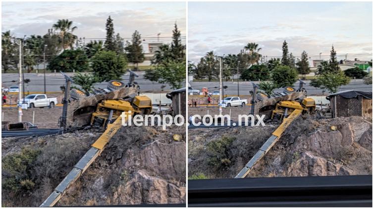 El Gobierno Municipal informó sobre el accidente de una grúa que se volcó cuando movía material en las obras de la Gaza Colgante del Teófilo Borunda y casi Periférico de la Juventud.