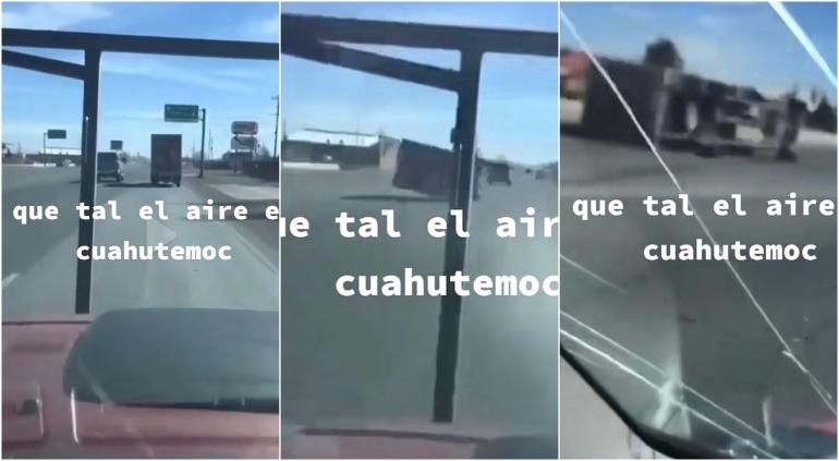 A través de redes sociales fue compartido un video en las últimas horas del momento en que los fuertes vientos voltearon a un transporte de varga en Cuauhtémoc.