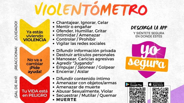 El Violentómetro muestra de manera clara y gradual diversas conductas que constituyen violencia, desde aquellas que suelen normalizarse, como chantajear, ignorar, celar, mentir, humillar o controlar, hasta agresiones como amenazas, abuso, privación de la libertad y el feminicidio.