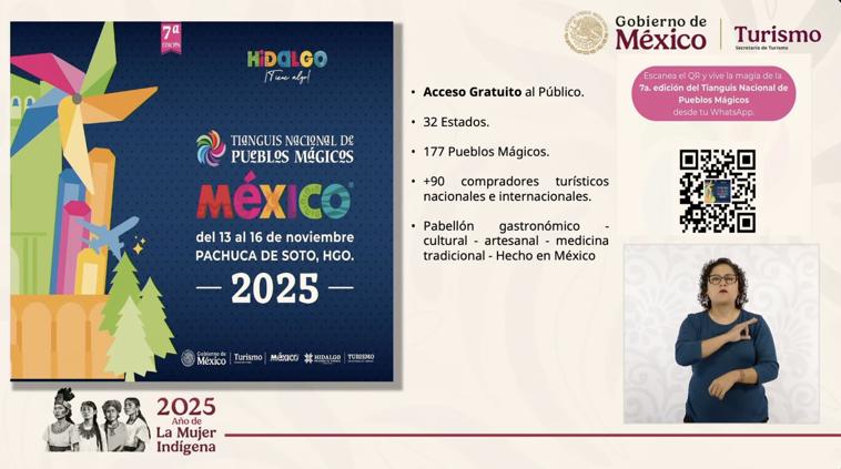 La funcionaria destacó que el tianguis permitirá a visitantes y familias conocer de primera mano la diversidad cultural del país y fortalecer el turismo interno. Añadió que, como parte de la tradición de los viernes en La Mañanera del Pueblo, invitó también a explorar el estado de Zacatecas, uno de los destinos recomendados de la semana.