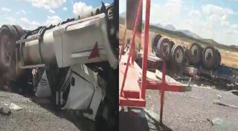 Un tráiler con doble semirremolque volcó a la altura del kilómetro 197 de la carretera a Ciudad Juárez.