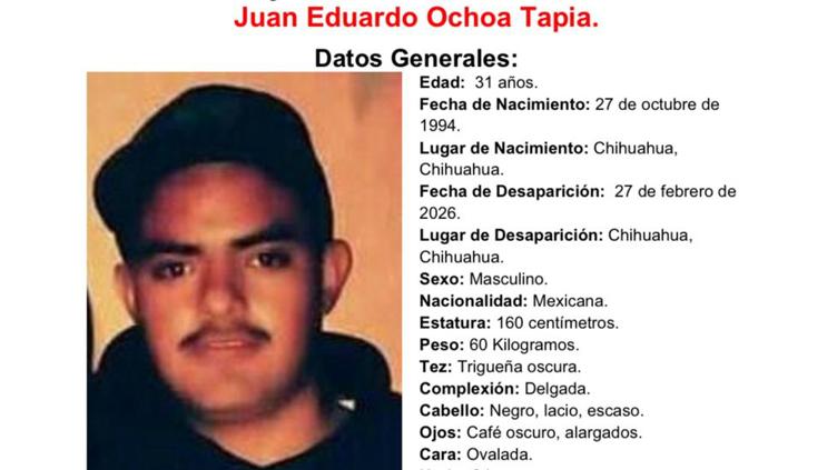 El ciudadano Juan Eduardo Ochoa Tapia, de 31 años de edad, desapareció en la colonia 2 de octubre, al sur de la ciudad de Chihuahua.