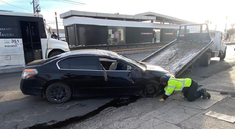 Agentes de la Policía Vial abanderaron el tráfico en el lugar y el operador de una grúa devolvió al auto a sus posición normal para posteriormente retirarlo de los carriles de circulación.