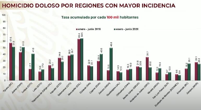 Con una gráfica, destacó que “donde la línea verde es mayor a la roja hemos avanzado, por ejemplo en Ciudad Juárez se ha avanzado de manera importante”.