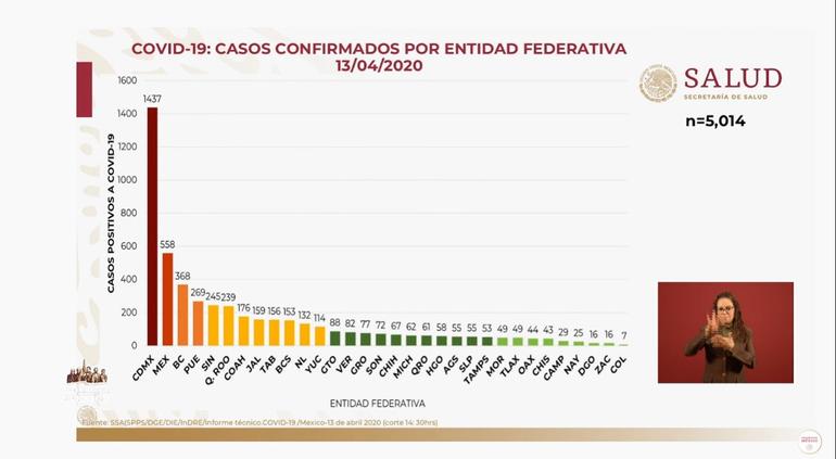 La Secretaría de Salud anunció hoy que el número de casos confirmados son 5,014, así como 332 fallecimientos debido a coronavirus (COVID-19); Colima es la única entidad federativa sin muertes.