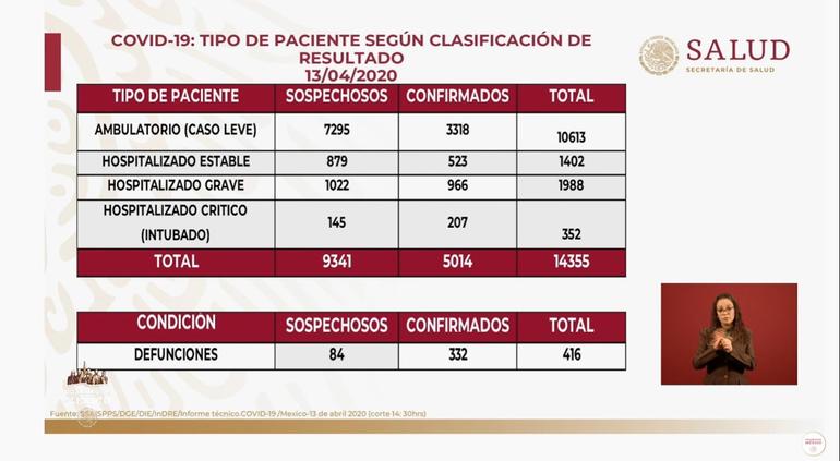 De acuerdo con el reporte de este 13 de abril se tiene un total de 5,014 contagiados y 332 fallecidos en el país debido al coronavirus (COVID-19), según lo comentó el Director General de Epidemiología, José Luis Alomía.