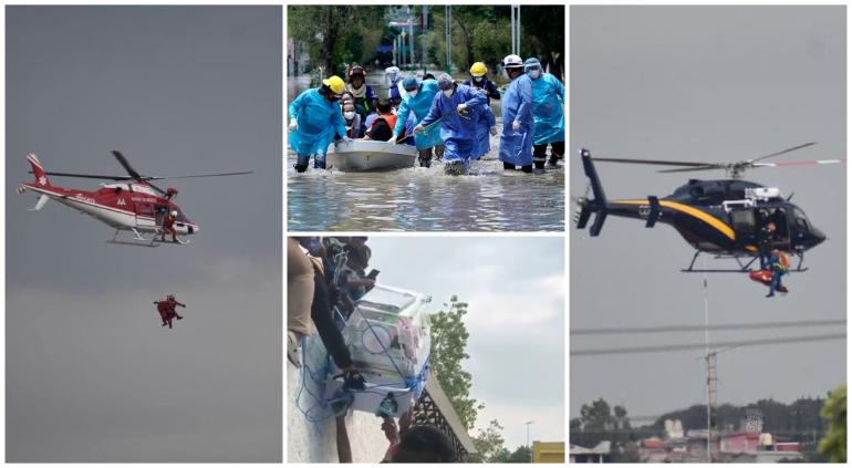 En el municipio en mención, el Ejército Mexicano, Protección Civil, Bomberos, Cruz Roja, Conagua y la Guardia Nacional también auxilian y rescatan personas afectadas por las inundaciones.