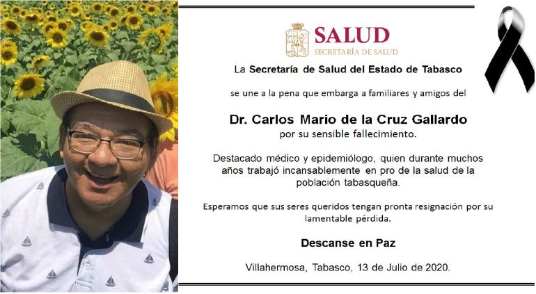 Poco antes la Secretaría de Salud de Tabasco emitió esquela para extender el pésame a amigos y familia del doctor De la Cruz Gallardo, a quien reconocieron por su trabajo incansable en pro de la salud del estado.