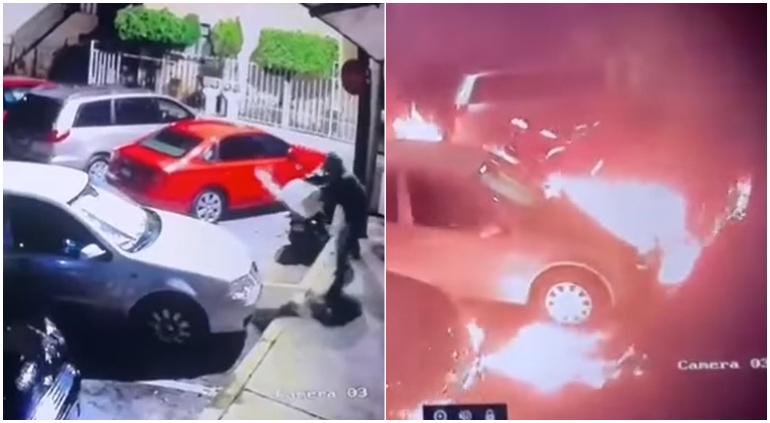 Es visible cómo al menos sujetos cometen el delito, uno de ellos carga un garrafón lleno de aparente gasolina que roció sobre los vehículos estacionados. Mientras que el segundo hombre se encarga de prenderles fuego.