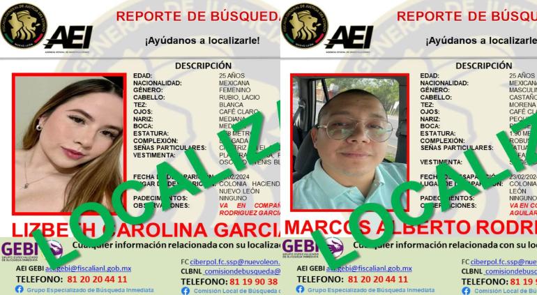 Ante esta situación, la Fiscalía General de Justicia de Nuevo León a través del GEBI emitió un reporte de búsqueda para localizar a Lizbeth Carolina García Aguilar y Marcos Alberto Rodríguez García.