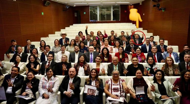 En la fotografía se le puede ver en la penúltima fila, con una sonrisa y rodeado de manos que levantan cuatro dedos en representación de la 4T.