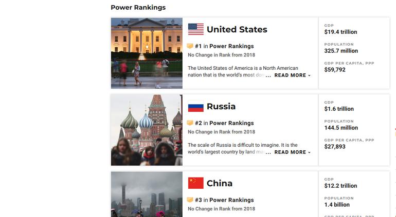 En la lista de países más influyentes y poderosos del 2019 hecho por analistas de la empresa BAV Group y la Escuela de negocios Wharton de la Universidad de Pennsylvania, ponen a Estados Unidos en primer lugar nuevamente, pues poseen “la más dominante economía y el mayor poder militar del planeta”.