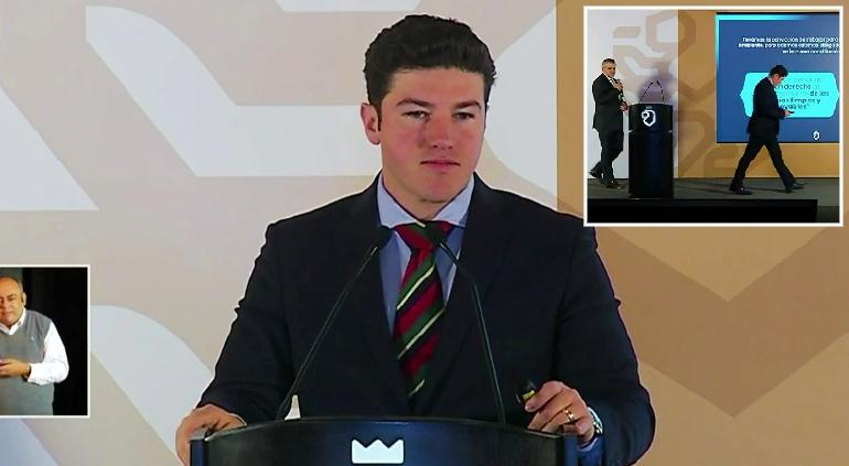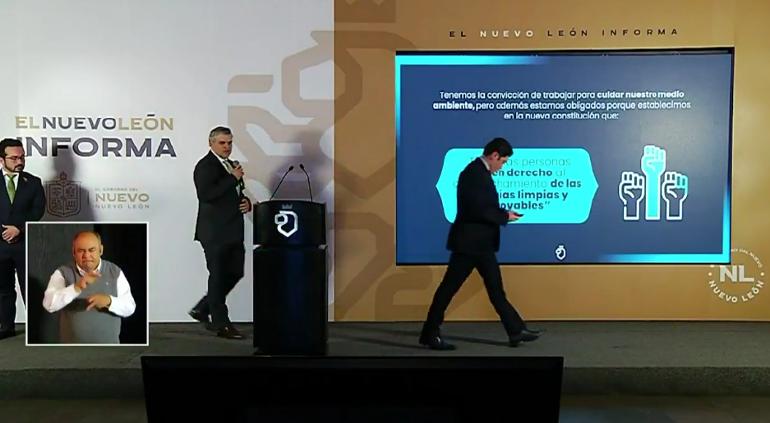 Samuel García daba un discurso en transmisión en vivo para el lanzamiento de la Agencia de Energía Renovable de Nuevo Léon, que tuvo que interrumpir.