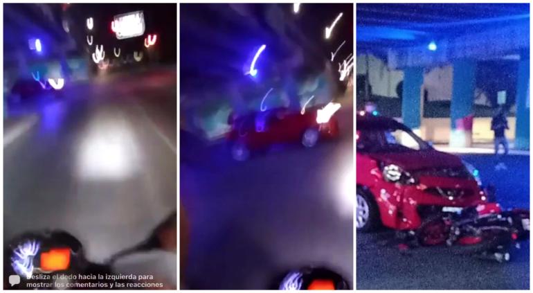 El conductor de la motocicleta maneja en alta velocidad, omite semáforos y no portaba casco, lo que de repente terminó, cuando un Nissan March lo impacta en un cruce.