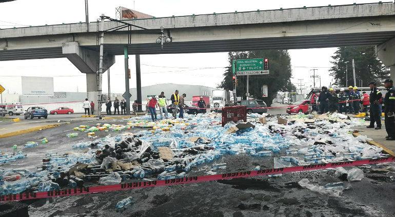 Un camión de la empresa Coca- Cola intentó ganarle el paso al tren en Toluca. Este terminó por embestirlo. Los productos terminaron por el suelo y decenas de personas aprovecharon para realizar rapiña.