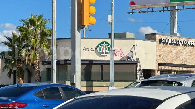 Sujetos vandalizaron la sucursal de Starbuck en avenida Mirador y boulevard Ortiz Mena, al poniente de la ciudad de Chihuahua, como boicot en torno a la situación de los palestinos en Gaza.