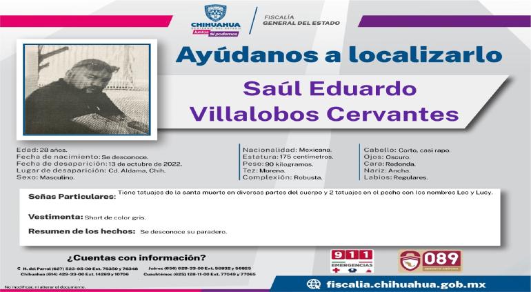 La Fiscalía y familiares solicitan ayuda para encontrar a Saúl Eduardo Villalobos Cervantes de 28 años quien fue visto por última vez el 13 de octubre del presente año en Aldama. Hasta el momento desconocen su paradero.