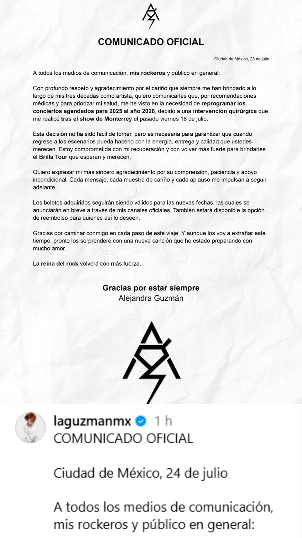 La cantante Alejandra Guzmán anunció que no podrá realizar su gira “Brilla Tour” en 2025, ya que necesita recuperarse de una cirugía de emergencia. La cantante explicó que, por indicaciones médicas, debe hacer una pausa en su carrera para cuidar su salud.