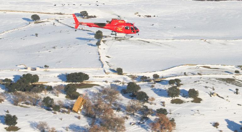 Autoridades enviaron a Colmenar Viejo, un helicóptero del Grupo Especial de Rescate en Altura del Cuerpo de Bomberos, para llevar alimento a 400 animales de diez explotaciones extensivas de ganado.