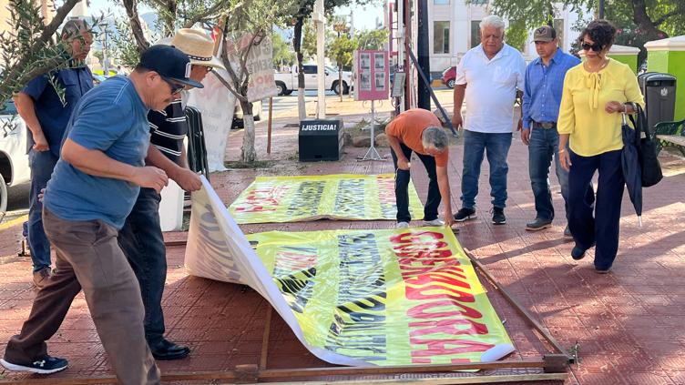 Colocaron diversos vehículos a un costado de la Plaza Hidalgo, sobre la calle Aldama, en donde alistaron lonas y pancartas.