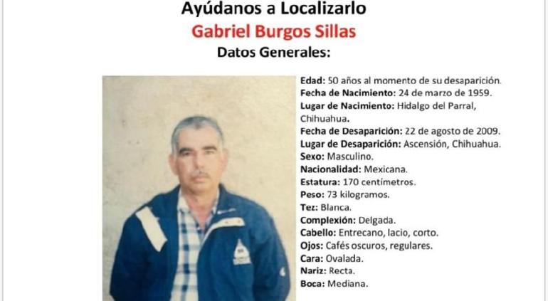 La Fiscalía solicita ayuda para encontrar al señor parralense Gabriel Burgos Sillas, quien desapareció a sus 50 años el 22 de agosto del 2009 en Ascensión. Por ahora se desconoce su paradero.