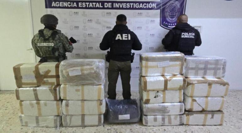 Elementos de la Fiscalía localizaron una camioneta Blazer con reporte de robo, encontraron 170 kilos de marihuana y un kilo de fentanilo, esto en una brecha del Ejido Sacramento.
