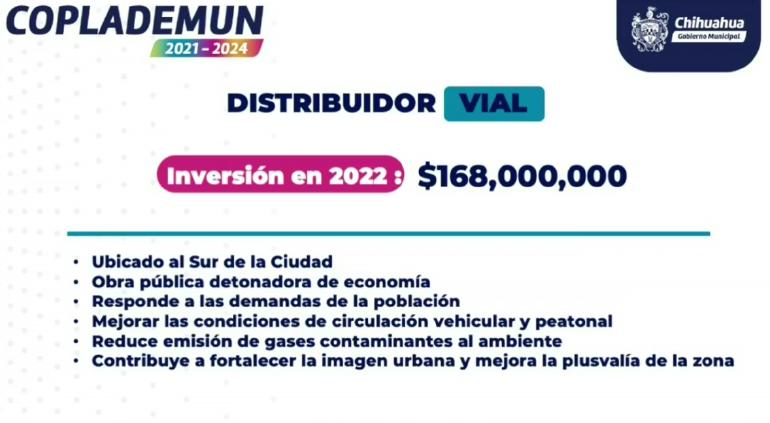A través de una conferencia de prensa, el Presidente Municipal de Chihuahua, anunció la construcción de un nuevo distribuidor vial en la avenida Fuentes Mares, el cual tendrá un costo de 168 millones de pesos.