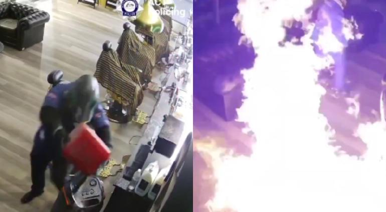 Una cámara de seguridad de una barbería en Gungahlin, Australia, grabó a un hombre que entró en la noche, cuando el negocio estaba cerrado, y comenzó a rociar todo el lugar con gasolina que llevaba en un bidón.