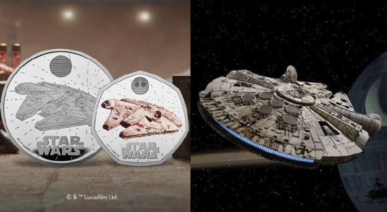 La primera moneda en salir a la venta, con un costo de 50 peniques, es la moneda dedicada a la famosa nave espacial “Halcón Milenario” junto con el símbolo de la icónica insignia “Rebel Alliance Starbird” que se puede ver con el reflejo de la luz.