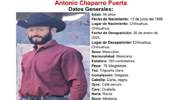 El ciudadano Antonio Chaparro Puerta, de 36 años de edad, desapareció el pasado 26 de enero, en la ciudad de Chihuahua.