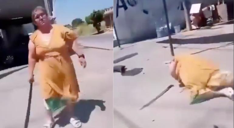 Ante ello, la persona que estaba grabando la enfrentó y esta le lanzó un machetazo, siendo en ese momento que se tropezó con un tornillo que estaba en el suelo y cayó.