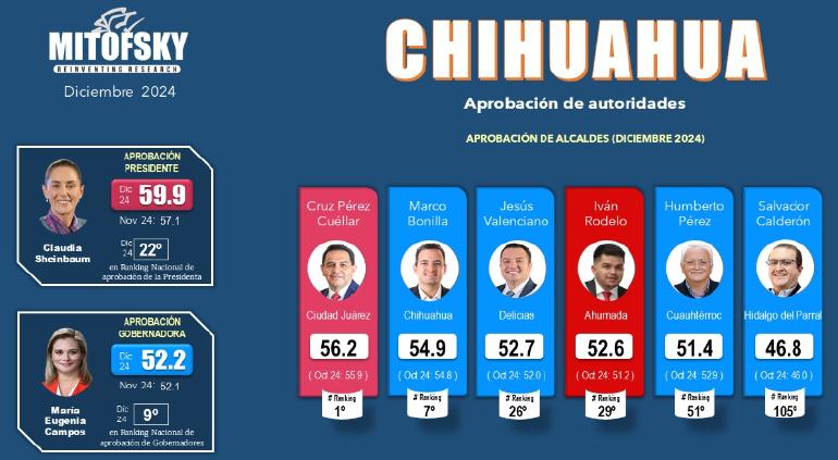 Consulta Mitofsky por primera vez publicó la encuesta de aprobación de la presidenta Claudia Sheinbaum en el estado, comparada con la gobernadora Maru Campos y los alcaldes de seis de los principales municipios, entre ellos Cruz Pérez Cuéllar de Ciudad Juárez y Marco Bonilla de Chihuahua capital.
